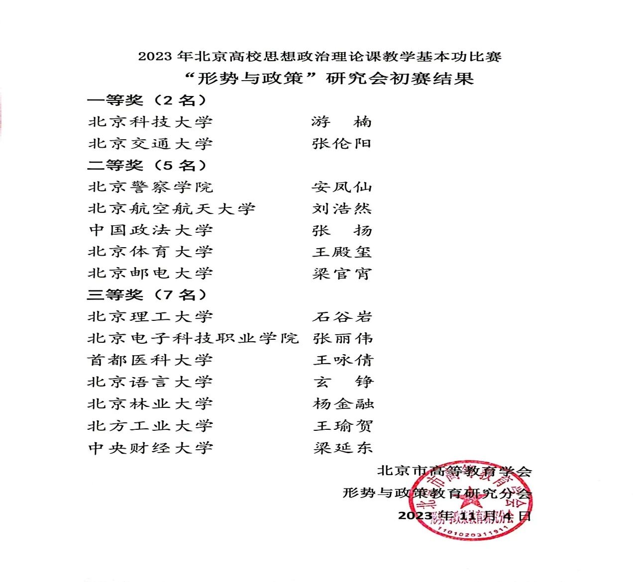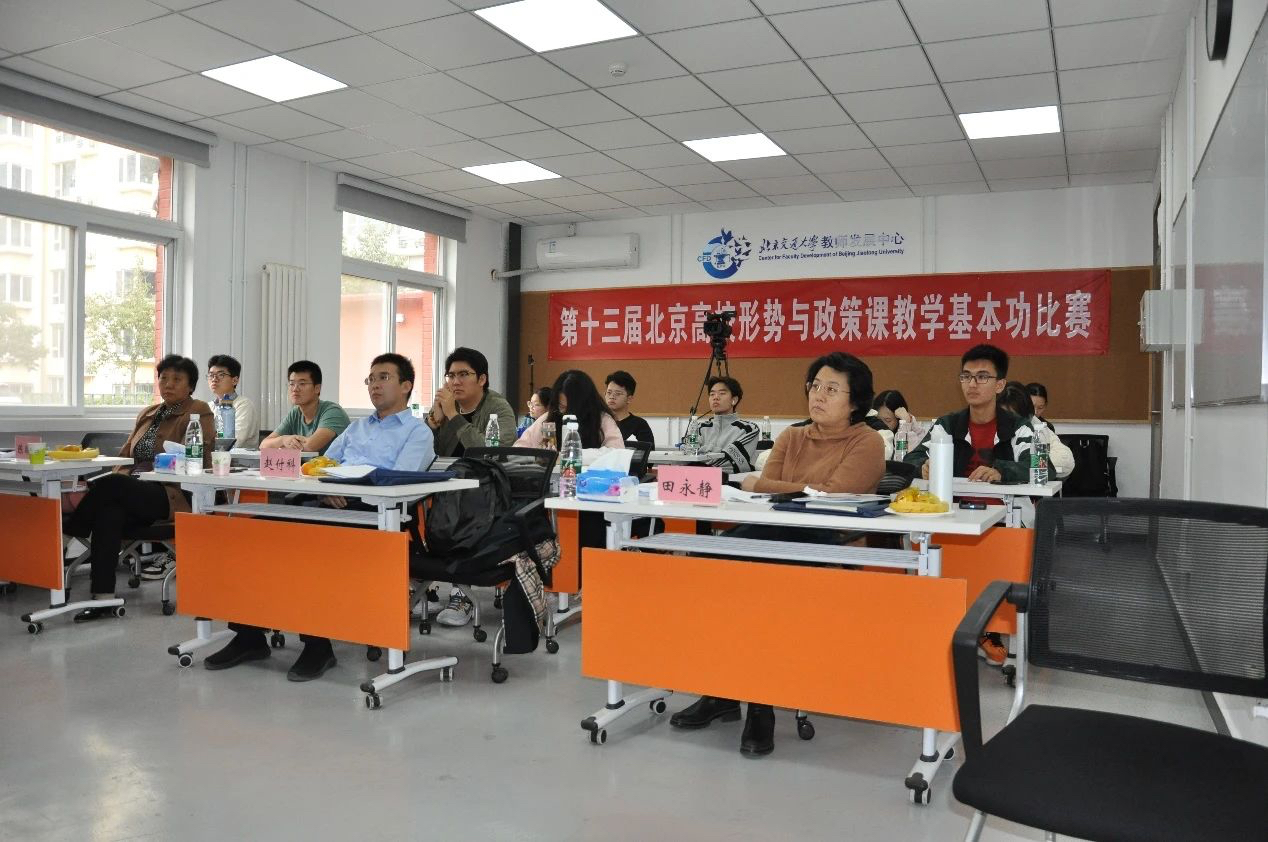 本次比赛由北京市高等教育学会形势与政策教育研究分会主办,北京交通大学马克思主义学院承办。来自北京大学、北京航空航天大学、北京理工大学、北京邮电大学、中国政法大学、英国365上市公司官网、对外经济贸易大学、北京科技大学、北京林业大学、北京化工大学、北京交通大学等24所在京高校的“形势与政策”课教师参加了比赛。比赛以推动党的二十大精神融入思政课教学为主题,重点考察思政课教师学深悟透党的二十大精神,并将其融入课堂教学的理论水平,特别是立足京华大地生动实践讲好“大思政课”的能力。