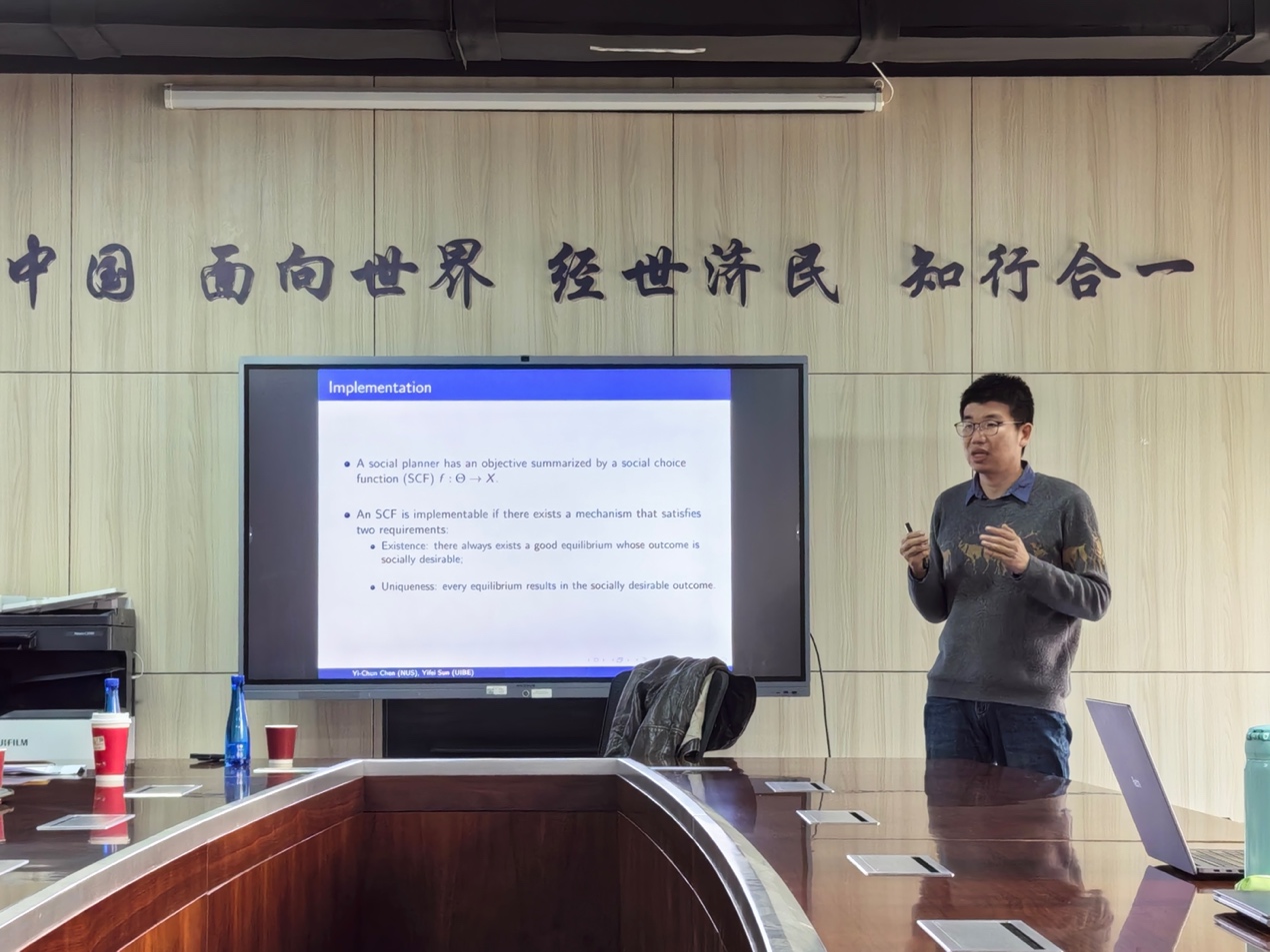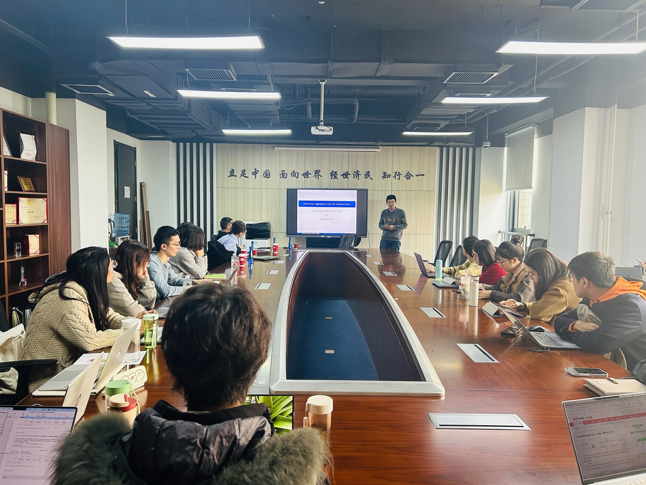 2024年10月25日下午,对外经济贸易大学经济学系孙一飞教授应邀为我校师生主讲“Full Implementation and Information Aggregation”讲座,讲座于学院楼11号楼308会议室举行。365英国上市集团龚雅娴副教授主持讲座,张志祥、李东阳等多位校内老师和三十余名同学参加了此次讲座。