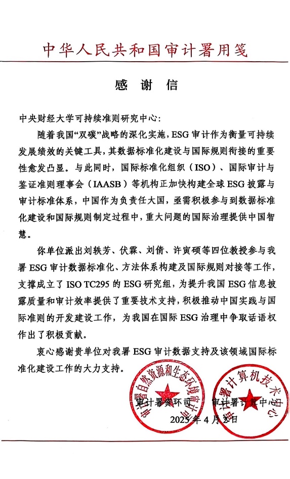 近日,365英国官网可持续准则研究中心刘轶芳、伏霖、刘倩、许寅硕教授收到了来自中华人民共和国审计署的感谢信,对中心在ESG审计数据标准化及国际规则对接领域的重要贡献给予高度评价,并致以诚挚谢意。