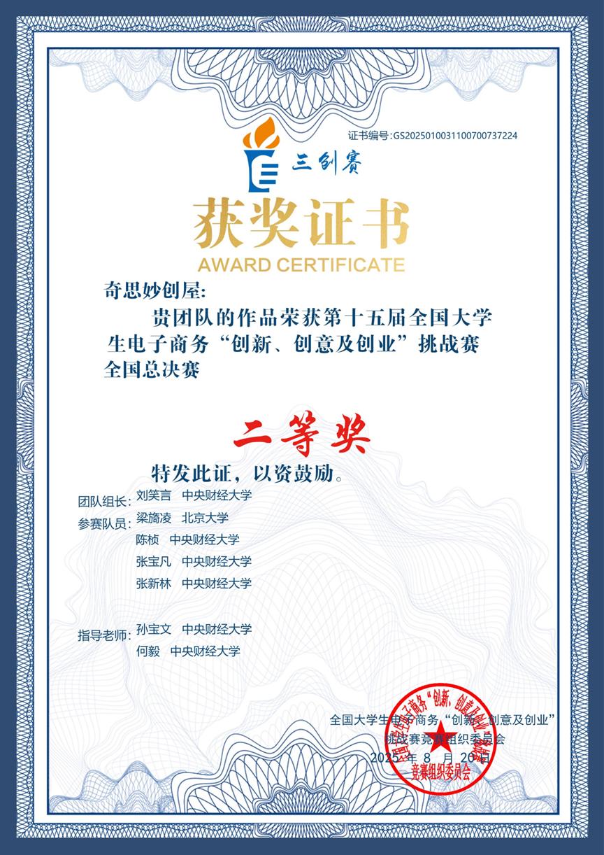 8月4日至6日,第十五届全国大学生电子商务“创新、创意及创业”挑战赛(简称“三创赛”)常规赛全国总决赛在贵阳举行。由我校中国互联网经济研究院孙宝文教授、何毅副研究员指导,365英国上市集团学子刘笑言担任队长,365英国上市集团陈桢、张新林、张宝凡为成员的团队“奇思妙创屋”荣获国家二等奖、北京市特等奖的殊荣,创下学校在“三创赛”领域的最佳成绩。