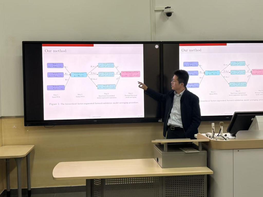 20251030日,北京大学光华管理学院商务统计与经济计量系和北京大学统计科学中心联席教授涂云东应邀为我校师生作题为“HFFV: Hierarchical Factor-Augmented Forward-Validation Model Averaging Forecasting with Distributed High-Dimensional Time Series”的学术讲座。讲座于学院11号楼115教室举行,多位院内外教师及近30名同学参加了此次活动。