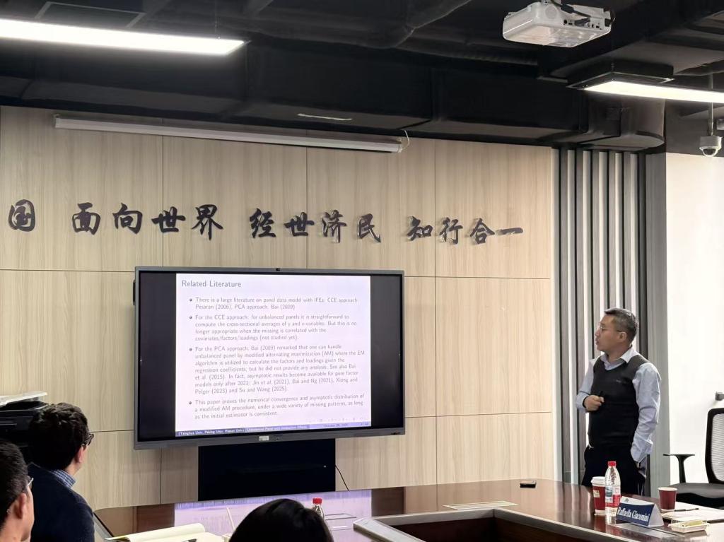 2025年10月30日,清华大学经济管理学院C.V. Starr讲席教授苏良军应邀为我校师生作题为“Estimation and Inference for Unbalanced Panel Data Models with Interactive Fixed Effects”的学术讲座。讲座于学院11号楼308教室举行,多位院内外教师及近30名同学参加了此次活动。