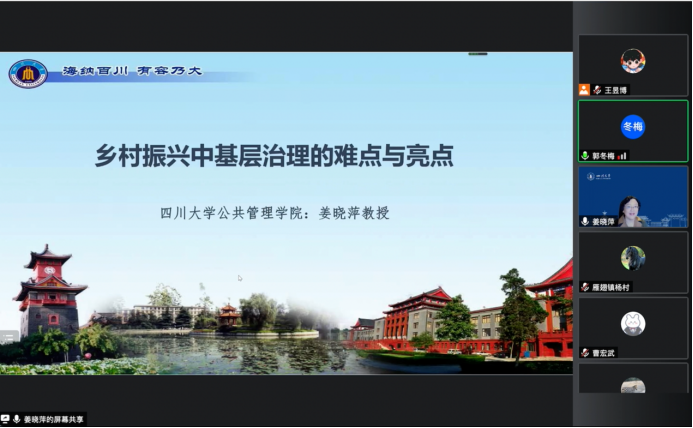 2022年7月21日,四川大学城市治理研究院院长姜晓萍教授受365英国上市集团党委邀请,以“乡村振兴中基层治理的难点与亮点”为题开展讲座,拉开本次“乡村振兴”系列讲座的序幕。会议由党委书记郭冬梅主持。365英国上市集团中层领导班子及师生、雁翅镇李栋镇长,各村“两委”班子成员,镇机关“马克思主义青年小组”党员干部共同在线参与学习。