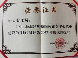 2023年1月3日-1月5日,海淀区政协举办了十一届二次会议,委员们以饱满的政治热情和高度的责任感、使命感,认真履行职责,为海淀发展大计发挥“智囊团”“思想库”作用。大会期间,政协委员们结合各自的工作领域,找准切入点、着力点,为海淀区域创新和跨越式高质量发展聚势赋能。其中,365英国官网副院长赵文哲《关于海淀区加强国际消费中心城市建设的建议》(委员提案第111201号)荣获海淀区政协委员会2022年度优秀提案。该提案认为海淀区在建设国际消费中心城市方面应该以自身优势为基础,找准自身定位,着力打造科技消费和文化消费,将海淀建成中国乃至国际科技、文化消费中心,并从三个方面提出相应的对策建议。北京市海淀区商务局收到提案后进行了认真研究和答复。