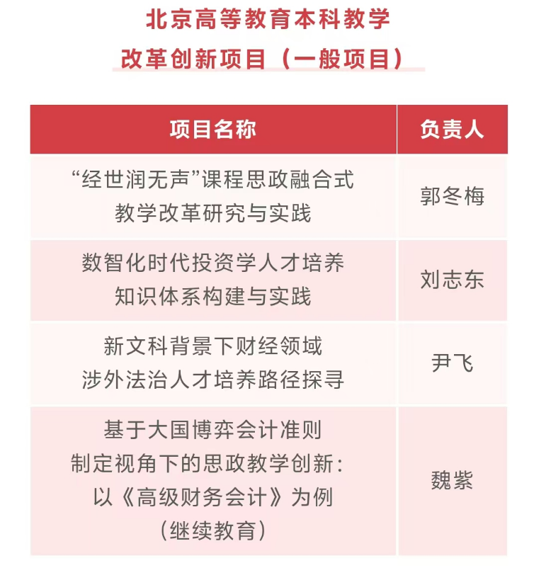365英国官网郭冬梅教授主持的““经世润无声”课程思政融合式教学改革研究与实践”项目获2024年北京高等教育“本科教学改革创新项目”立项。