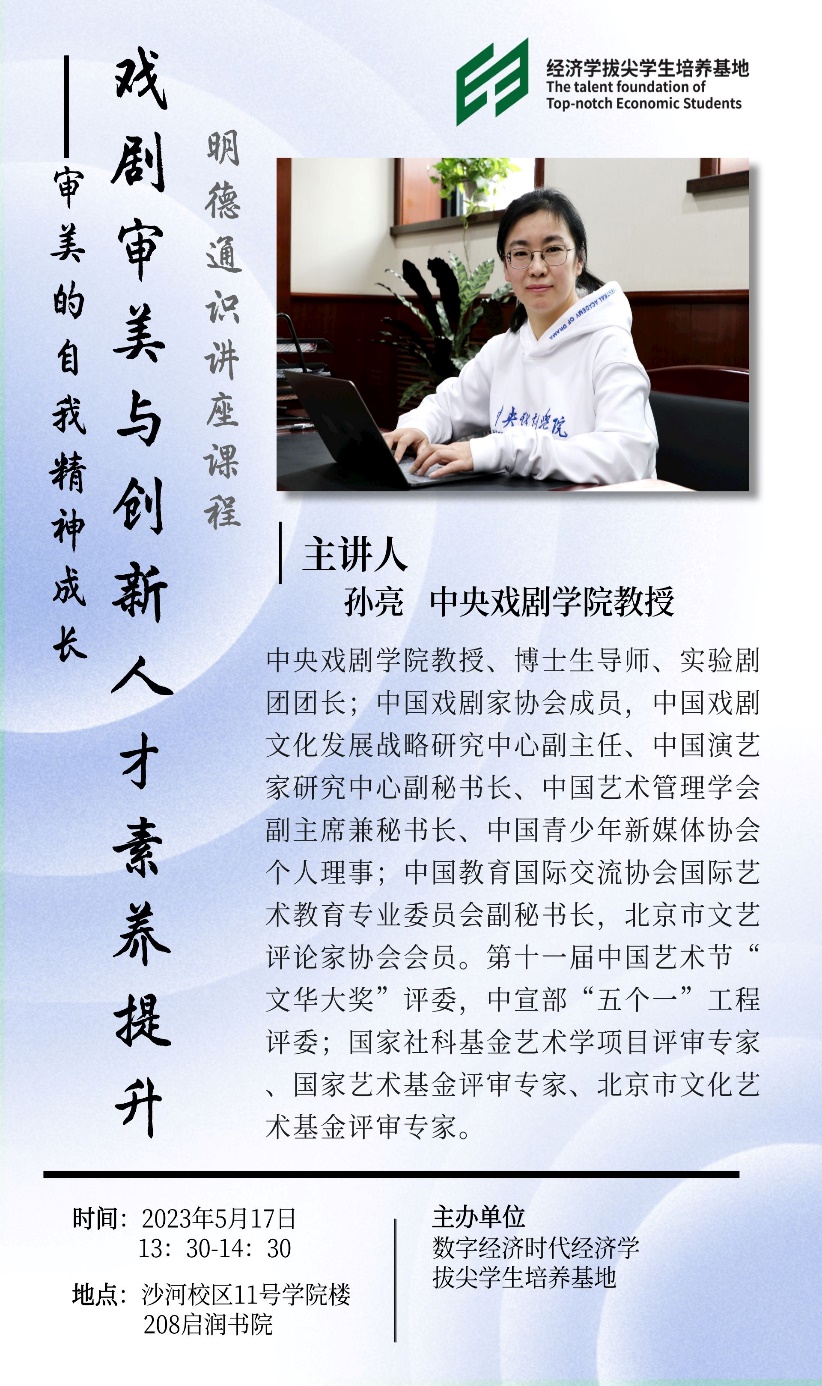 2023年5月17日,基地在沙河校区11号楼208教室“启润书院”举办了新一期的“明德通识讲座”。本次讲座邀请中央戏剧学院教授、实验剧团团长孙亮担任主讲人,讲座题目为“戏剧审美与创新人才素养提高—审美的自我精神成长”。