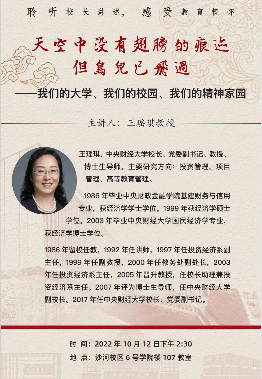 2022年10月12日下午,基地在沙河校区6号楼107教室举办了新一期的“明德通识讲座”。本次讲座邀请时任我校校长、基地管理委员会主任王瑶琪教授担任主讲人,讲座题目为“我们的大学、我们的校园、我们的精神家园”。