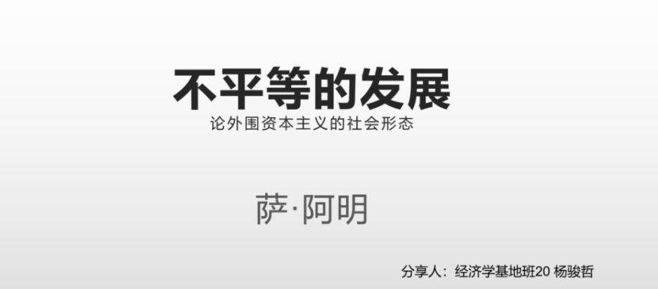 | 杨骏哲同学分享的是由埃及著名经济学家萨·阿明所写的《不平等的发展》一书。本书的副标题《论外围资本主义的社会形态》表现了本书的主旨是以分析不发达问题为中心。作者不仅对亚、非、拉中一些国家发展道路进行了剖析,而且对整个资本主义南、北世界,即外围与中心,进行历史的和地域的纵横描述。 |