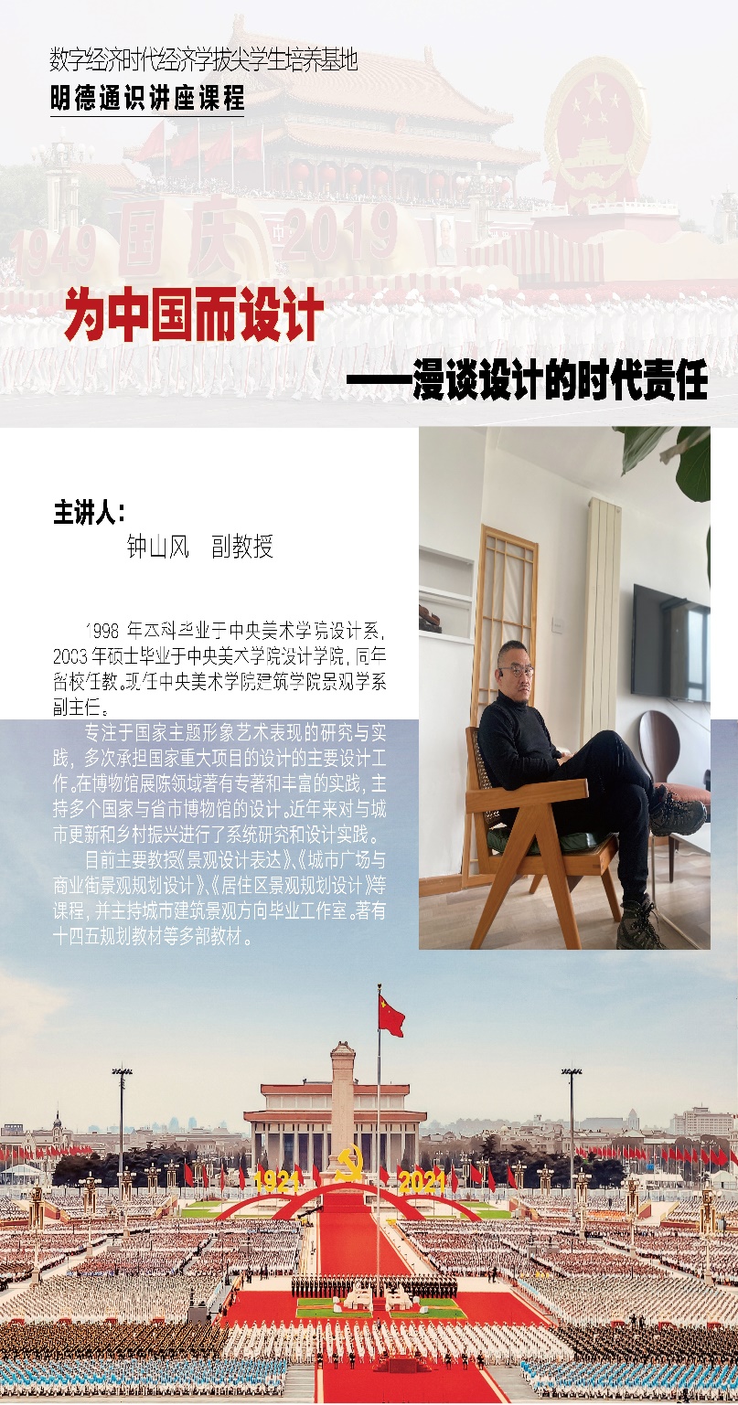 2023年4月19日,基地在沙河校区6号楼107教室举办了新一期的“明德通识讲座”。本次讲座邀请中央美术学院建筑学院景观学系副主任钟山风副教授担任主讲人,讲座题目为“‘为中国而设计’——漫谈设计的时代责任”。