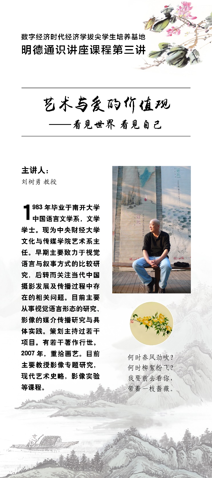 2021年11月24日下午,基地邀请到我校文化与传媒学院艺术系主任刘树勇教授做“艺术与爱的价值观——看见世界,看见自己”主题讲座。