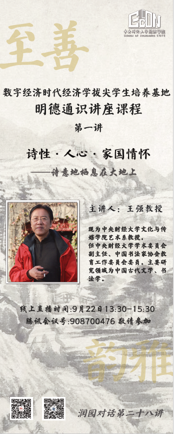2021年9月22日下午,数字经济时代经济学拔尖学生培养基地(以下简称为“基地”)邀请到了我校文化与传媒学院艺术系的王强教授做“诗性·人心·家国情怀——诗意地栖息在大地上”主题讲座。