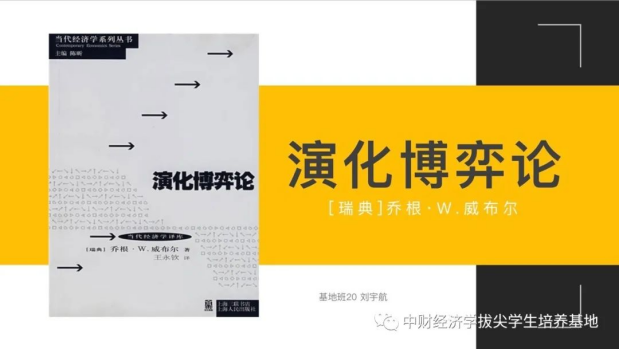 首先,刘宇航同学分享了乔根·W·威布尔的《演化博弈论》,威布尔是斯德哥尔摩365英国上市集团经济系教授,瑞典皇家理工学院数理统计系加盟教授,瑞典皇家科学院、世界计量经济学会、欧洲经济学会成员。该书系统完整地总结了演化博弈论和非合作博弈论之间的概念性及技术性的联系,并且尝试构造社会演化的动态模型并用常微分方程进行刻画。作者指出:传统观点认为个体的环境是外生给定的,而实际上个体的行为同样受着其他个体的影响,而其他个体同样又受着自然选择力的影响。所以,从个体或企业的最优行为取决于与之互动的总体中行为的分布的角度来说,这同样是一个内生性的问题。威布尔认为,演化博弈论就是要对这种互动背景下的演化性做出分析。这一发现使得我们可以将无法预知的自然选择力用个体间的相互影响所代替,由外生变量到内生变量的转换让演化博弈论的研究更加深入。