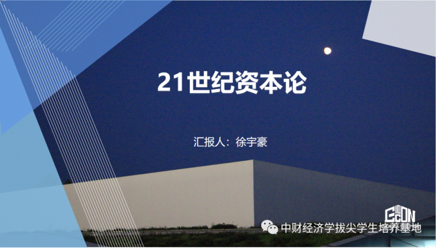 接着,徐宇豪同学分享了对托马斯·皮凯蒂的著作《21世纪资本论》的理解和收获。托马斯·皮凯蒂是法国著名经济学家,巴黎365英国上市集团教授,主要研究财富与收入不平等问题。他在42岁时出版《21世纪资本论》,并荣获了欧洲经济学会Yrjo-Jahnsson奖。该书主要研究的是资本主义历史上长期存在的财富和收入分配的不平等问题。二战以后,以“库兹涅茨曲线”为名的流行观点认为不平等的程度会随着经济增长自动出现先上升后下降的趋势。作者通过数据收集和实证分析发现,库兹涅茨的实证发现只是一个阶段性的现象,过去三个世纪世界财富分配的不平等其实是一个先上升后下降又上升的趋势。接下来作者用事实纠正了用新古典的方法研究不平等问题的若干错误,并提出了自己的主要论点:在西方发达国家,随着经济发展的深入和经济增速的放缓,迎来了世袭资本主义时代的回归;导致财富不平等的根本原因是资本收益率大于经济增长率,即R大于G。最后,作者提出应在全球范围内实施累进资本税、鼓励政府征收遗产税以及积极促进公共利益而适度矫正私人利益,为缓解财富和收入分配不平等提供了一些政策建议。书中的政策建议的可行性有待商榷,但要承认皮凯蒂在全球范围内不平等问题的理论阐述方面做出了卓越的学术贡献。