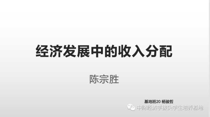 接着杨骏哲同学带来了他对陈宗胜的《经济发展中的收入分配》的思考和感悟。陈宗胜,男,山东威海乳山市人,现为南开大学经济研究所教授、博士生导师,政治经济学研究中心副主任;国家教委"跨世纪人才"第一批人选,国家人事部"百千万人才工程"第一、二层次人选。20世纪80年代中后期,随着改革开放的推进,中国社会居民之间收入差别明显增大。而有关经济发展和收入分配之间的关系,发展经济学中的经典假说是由库兹涅茨提出的“倒U”理论。该理论认为居民的收入差别会随着经济发展先增大后减小,但这是建立在私有制度的基础上得到的理论。在此理论基础上,作者想探究收入分配差别在公有制为主体的国家有怎样的变动规律。在公有经济基础上,依据中国制度背景和现实经济,作者提出公有经济收入差别的“倒U”理论,即公有制经济的收入分配差距也是随经济发展先增加后减小,并用此模型对中国发展现状进行分析,得出中国在20世纪80年代末处于不平等最高值点附近的结论。作者还开拓性地对中国非法收入进行了测算,衡量了中国存在的非法收入对分配不平等产生的影响。对此,在对中国现状进行分析时,应该基于一些西方私有制经济理论,结合中国国情和公有制性质合理借鉴西方经济学里的模型,而不能不分前提假设地将西方经济学模型套入中国经济发展,要创新性地继承西方模型。作者做出的理论贡献也论证了我国先富带动后富的合理性,适当的收入不平等在初级发展阶段对经济增长具有积极作用。