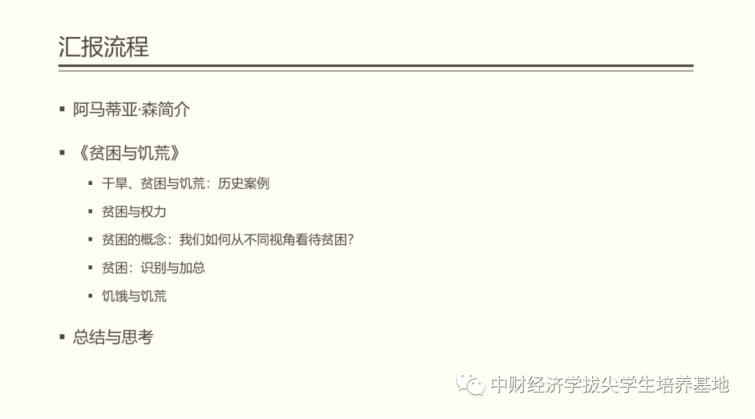 最后,沈千惠同学以丰富的案例为大家介绍了阿玛蒂亚·森的《贫困与饥荒》。本书探究了许多关于贫困的问题,主要包括对现存的一些贫困识别方法的例举与评价以及对贫困加总指标的讨论,并通过分析历史上的大饥荒讨论了各国导致贫困与饥饿的最终原因。该书的最大亮点在于将贫困问题的焦点从供给问题转为了权利分配问题,为理解与解决贫困问题深化了思路。作者阿玛蒂亚·森在《贫困与饥荒》中引入了一个重要的概念“权利方法”,它也是本书的核心。贫困并不是单纯的资源供给不足,更常见的是一种权利不足。贫困与饥饿的诱因往往是多样的,但造成贫困的直接原因是权利失败。每个社会个体的权利集合取决于其资源禀赋(所有权组合)和交换权利映射(通过生产或交换所获得的可支配的商品组合集合),而交换权利映射取决于法律、经济和社会特征等。此外,在对贫困的识别与度量方面,阿玛蒂亚·森评价了各种现存的概念及度量指标技术上的缺陷。这些概念与度量指标并非只有技术上的差别,它代表了不同的“贫困概念”,即人们理解贫困的不同方式。这些衡量指标不仅仅是数学上的定义,而是和社会偏好、消费习惯相关,如果忽略了这一前提,则难以对贫困进行精确的描述。