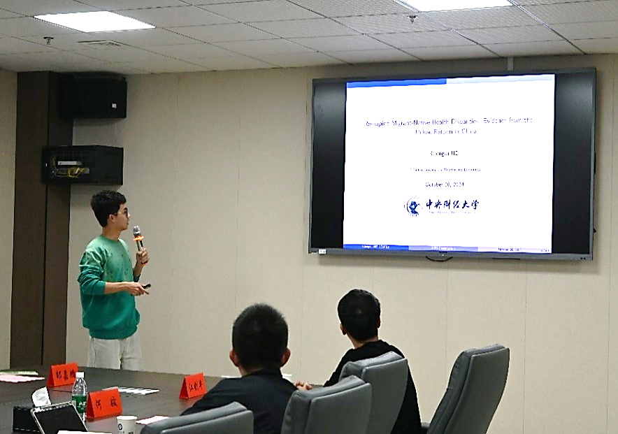 湘潭大学商学院经济学类(韶峰班)学生代表刘尧、贺嫦宇汇报了各自的工作论文。刘尧同学探究了社区食堂建设对老年人健康水平以及消费水平的影响,研究发现建设社区食堂对二者有显著的促进作用;贺嫦宇同学研究了同侪效应在班级近视率中的表现,是健康经济学领域较为新颖的探索。随后,梁银鹤老师分别就引言立意、选题创新性、文献贡献、识别策略为两篇文章提出了建设性意见。与会同学也就选题背景与回归结果的经济含义进行了充分讨论。