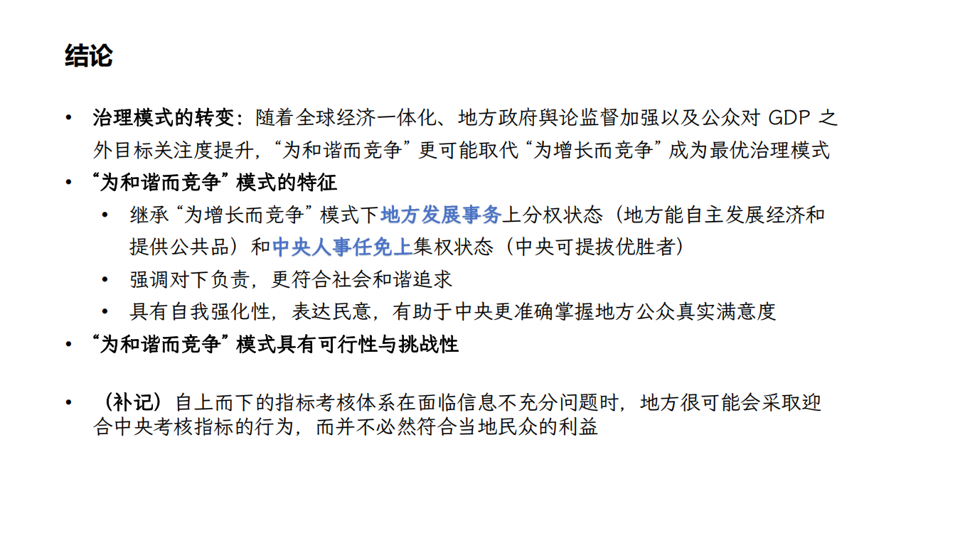 高冬阳同学接着介绍了《走向“为和谐而竞争”:晋升锦标赛下的中央和地方治理模式变迁》一文。文章构建了一个包含中央政府、地方政府和地方代表性居民的晋升锦标赛模型。该模型将地方政府的努力划分为促进经济增长和提供地方公共品两个方面,通过构建两阶段博弈的框架,考察了“为增长而竞争”(即基于GDP的晋升锦标赛)和“为和谐而竞争”(即基于居民满意度的晋升锦标赛)两种模式。研究发现,在基于GDP的晋升锦标赛下,地方政府更倾向于将努力投入到促进经济增长上,而基于居民满意度的晋升锦标赛能有效纠正前一种模式下公共品提供努力不足的问题。同时,随着经济全球化进程的推进、民意传达机制的完善和居民对公共品偏好的增加,“为和谐而竞争”模式更可能取代“为增长而竞争”模式。