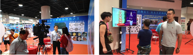 除了活体展示以外,本届展会中最大的亮点是增加了水族文化宣传和水族科技知识普及等活动,以引导观赏水族消费,培育水族产业市场。陈再忠教授接受了电视台的现场采访,并就七彩神仙鱼产业发展、人工繁育、种质改良、饲养管理等方面进行了现场解答。