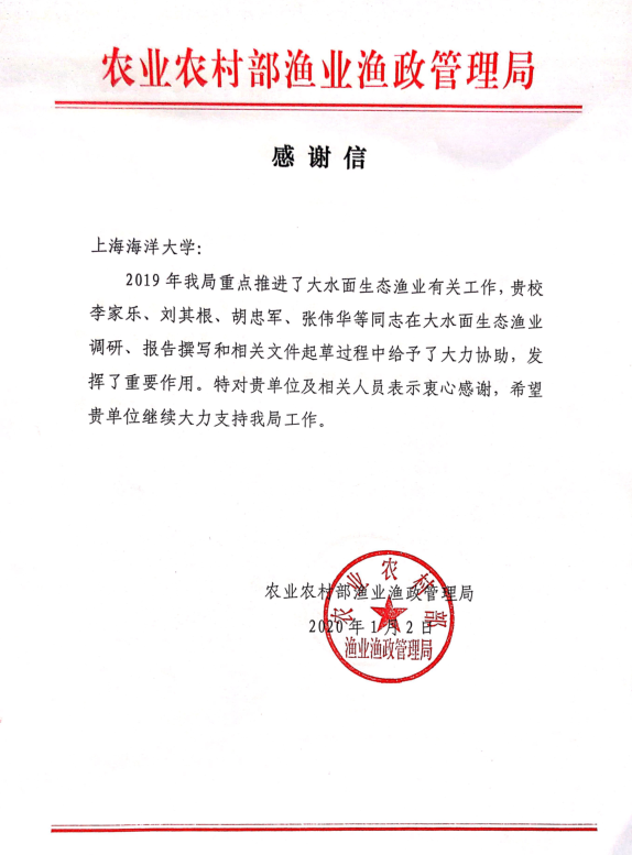 2020年1月2日,新年伊始第一个工作日,我校再次收到农业农村部渔业渔政管理局专门发来的感谢信,特别感谢我校教师协助农业农村部渔业渔政管理局在2019年重点推进大水面生态渔业方面做出的重要贡献。
